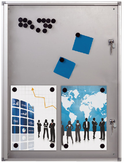 Suitable for indoor use. It has 2 different backing models. Each unit includes a free set of pins or magnets.Single key 4xA4, double key 6xA4, 9xA4 and 12xA4 sizes are available and can be used both in portrait & landscape positions. The cover can be opened to 90 degrees. Each unit includes mounting screw and plugs . The profile depth of the case 35 mm.